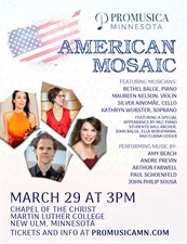 ProMusica Minnesota presents American Mosaic, a concert featuring Bethel Balge, piano, Maureen Nelson, violin, Silver Ainomae, cello, and Kathryn Wurster, soprano. Chamber music written by American composers in celebration of our country's 250th birthday! Sunday, March 29, 3 pm at Chapel of the Christ, Martin Luther College. Tickets $25 general admission, students free with ticket. promusicamn.com