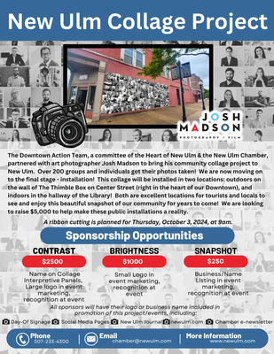 The Downtown Action Team, a committee of the Heart of New Ulm & the New Ulm Chamber, partnered with art photographer Josh Madson to bring his community collage project to New Ulm. Over 200 groups and individuals got their photos taken! The collage was then installed on the wall of The Thimble Box on Center Street (right in the heart of our Downtown), and now, as a part of the Wanda Gag birthday celebration will soon be installed as banners (with added Wanda elements!) indoors in the hallway of the Library! Both are excellent locations for tourists and locals to see and enjoy this beautiful snapshot of our community for years to come!