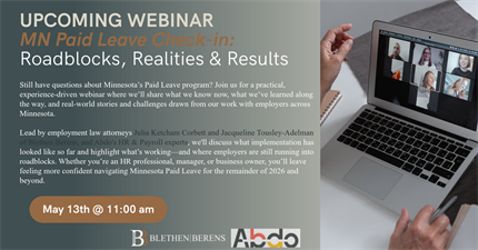 Lead by employment law attorneys Julia Ketcham Corbett and Jacqueline Tousley-Adelman of Blethen Berens, and Abdo's HR & Payroll experts, we'll discuss what implementation has looked like so far and highlight what’s working—and where employers are still running into roadblocks. Whether you’re an HR professional, manager, or business owner, you’ll leave feeling more confident navigating Minnesota Paid Leave for the remainder of 2026 and beyond.